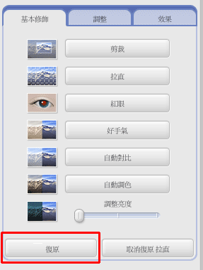 ■ 基本修飾 :共分剪裁、拉直、紅眼、好手氣、自動對比、自動調色、調整亮度。 |