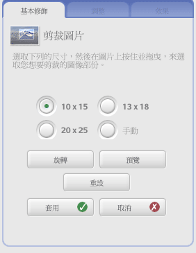 ,調整後按"套用"就會把剛才所做的修正套用至圖片中並回到上一層的選項中,或按取消回到上一層的選項中。