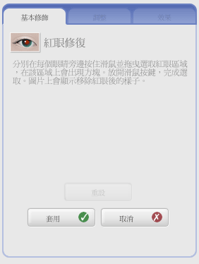 的紅眼,調整後按"套用"就會把剛才所做的修正 套用至圖片中並回到上一層的選項中,或按取消