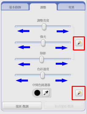 ■ 調整標籤 :共分亮度、強光、陰影、色彩溫度、中性色彩挑選器。 |