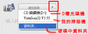 機,就會在這下拉方塊找到數位相機的機型代號,如果光碟機有放光碟片則才會有光碟機的選項,另外還有 掃瞄器及資料夾,如果你的圖片是放在電腦中則應該點選資料夾這一個選項,之後選取你要的圖檔後按確